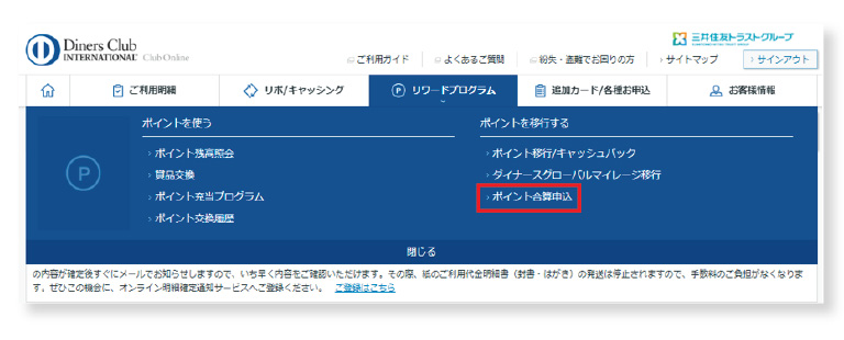 多くの会員様からのご要望にお応えし、2025年12月から会員専用オンラインサービス「クラブ・オンライン」での受付を開始しました。ダイナースクラブカードの追加カードに貯まったポイントの本会員カードへの合算を簡単にお手続きいただけます。