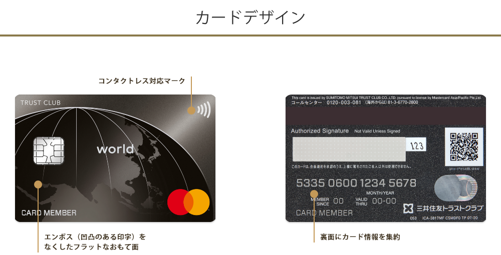 おもて面のエンボス(凹凸のある印字)をなくし、カード情報を裏面に集約。店頭でのカード決済時に第三者にカード番号等を盗み見されるリスクを軽減できるだけでなく、「世界で最も多くの場所で使える」Mastercard®をイメージしたグローブ(地球儀)のデザインがより引き立つカードに生まれかわりました。